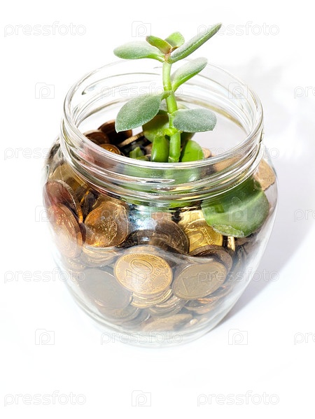 Стеклянная банка, наполненная металлическими монетами и ростком зеленого растения