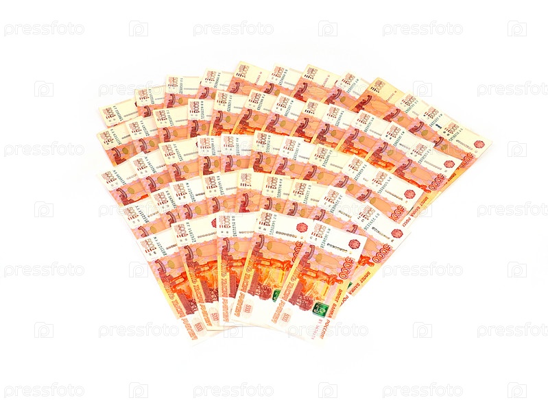 Веерообразная стопка бумаги пятитысячных банкнот российского рубля