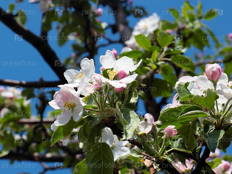 Красивые свежие бело-розовые цветки на ветвях весенней яблони