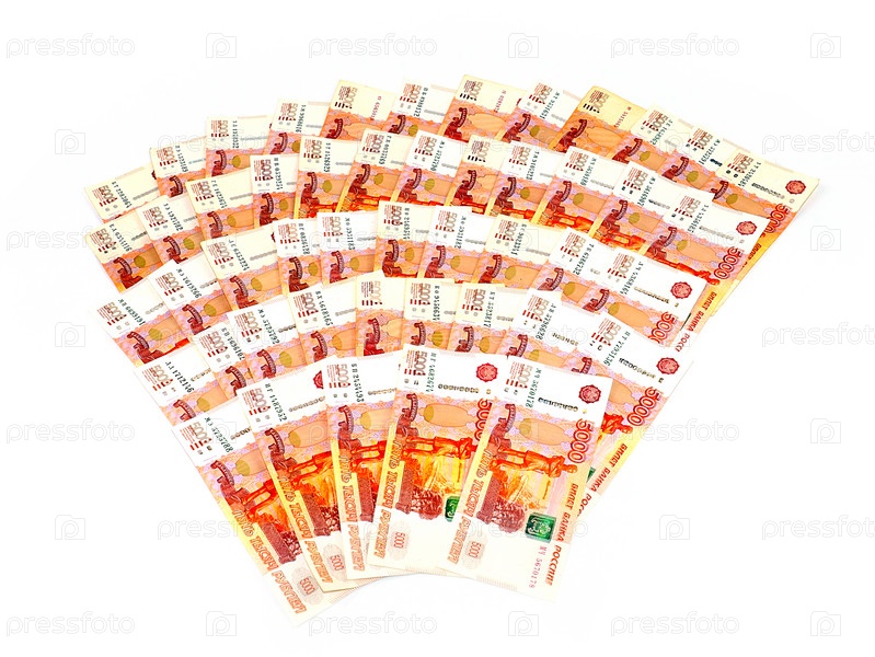 Веерообразная стопка бумаги пятитысячных банкнот российского рубля