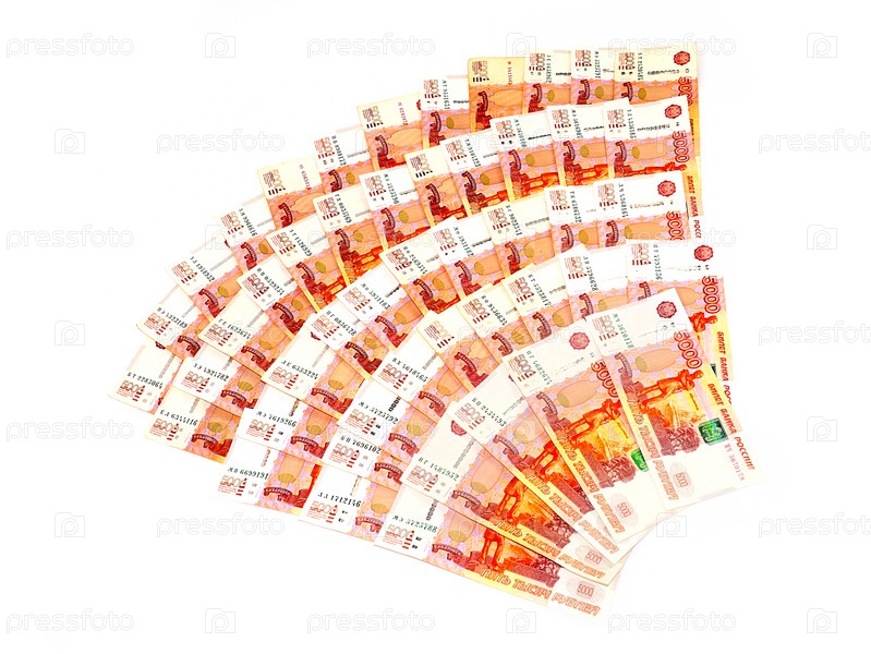 Веерообразная стопка бумаги пятитысячных банкнот российского рубля