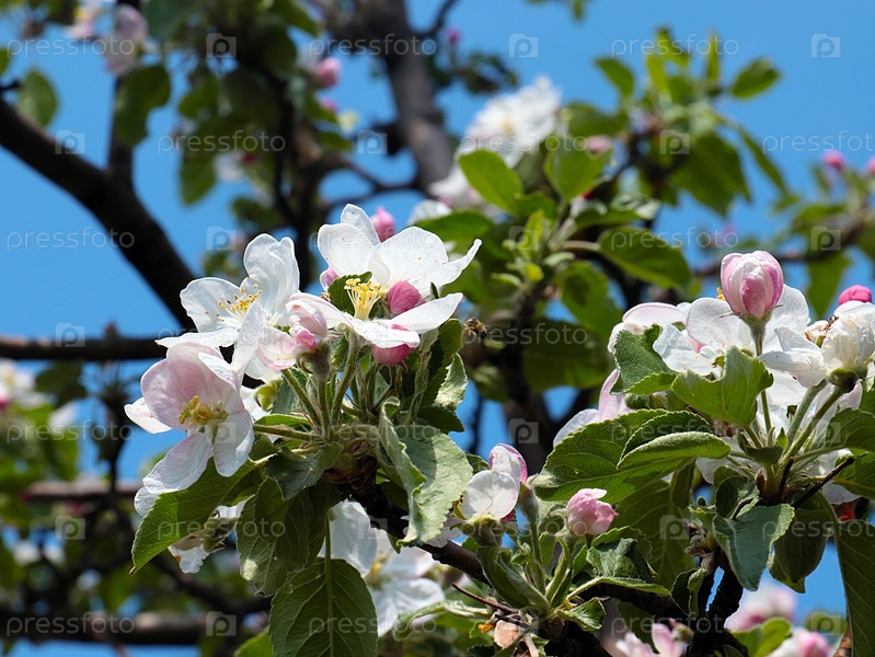 Красивые свежие бело-розовые цветки на ветвях весенней яблони