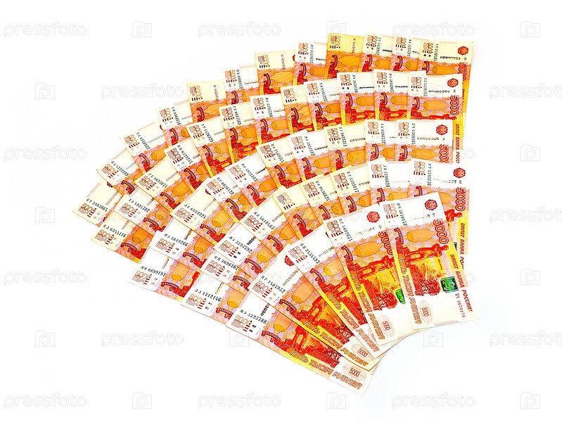 Веерообразная стопка бумаги пятитысячных банкнот российского рубля