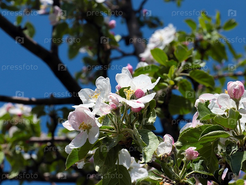 Красивые свежие бело-розовые цветки на ветвях весенней яблони