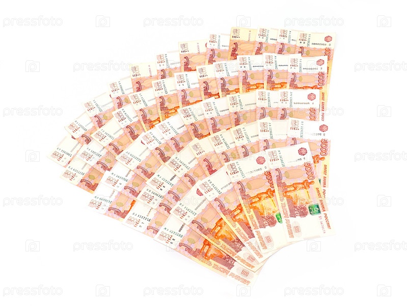 Веерообразная стопка бумаги пятитысячных банкнот российского рубля