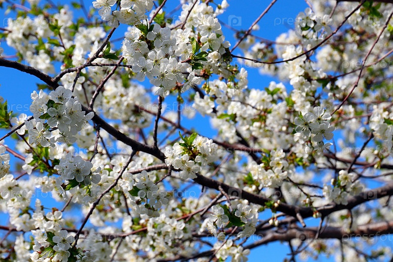 Красивые свежие бело-розовые цветки на ветвях весенней яблони
