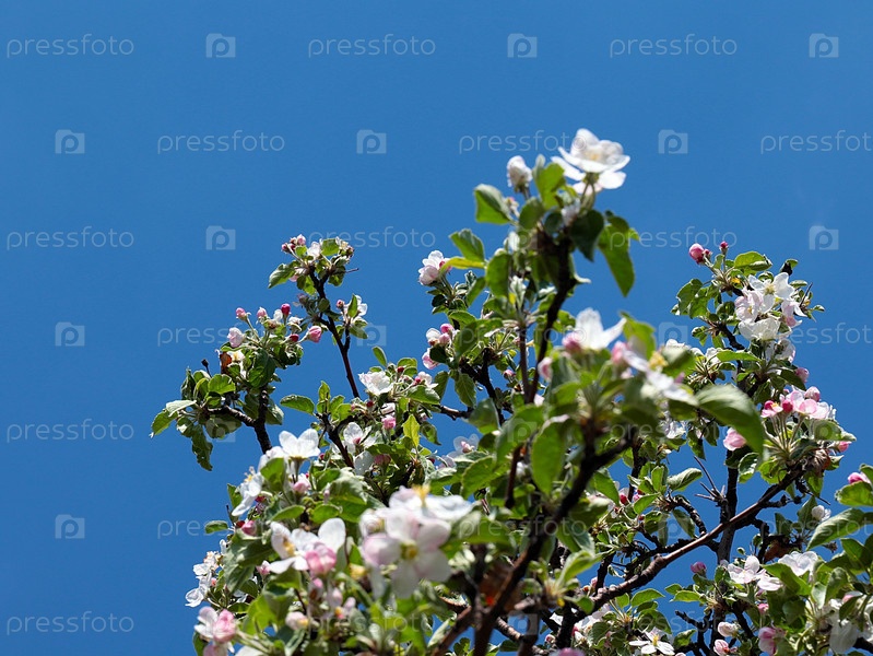 Красивые свежие бело-розовые цветки на ветвях весенней яблони