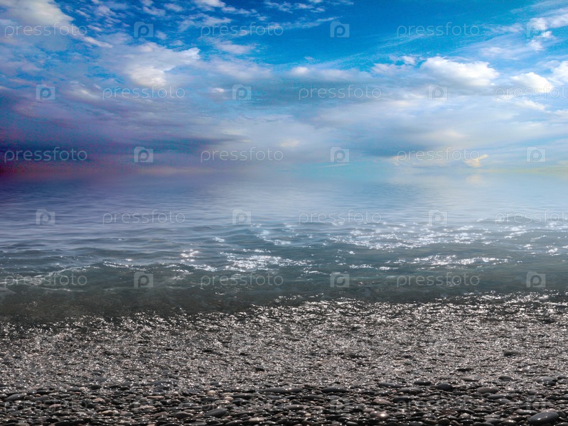 Красивый морской галечный пляж и облачное солнечное небо