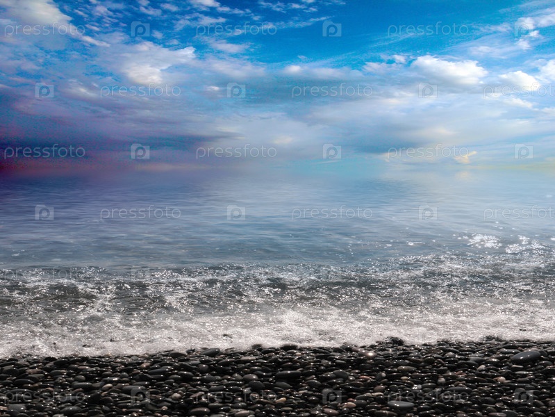 Красивый морской галечный пляж и облачное солнечное небо