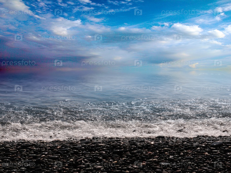 Красивый морской галечный пляж и облачное солнечное небо