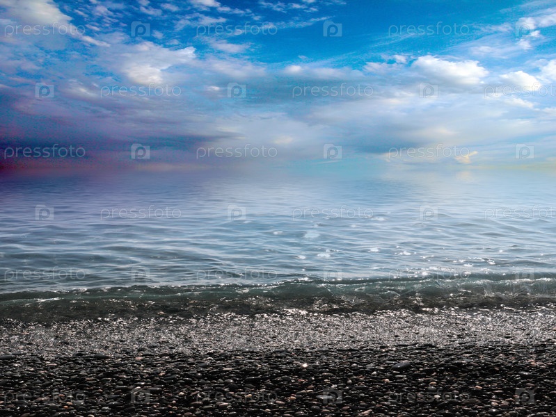 Красивый морской галечный пляж и облачное солнечное небо