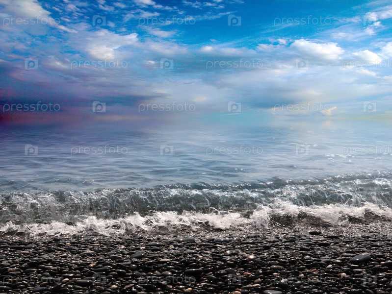Красивый морской галечный пляж и облачное солнечное небо