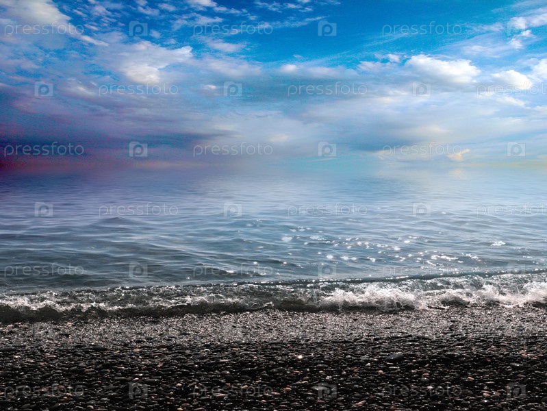 Красивый морской галечный пляж и облачное солнечное небо