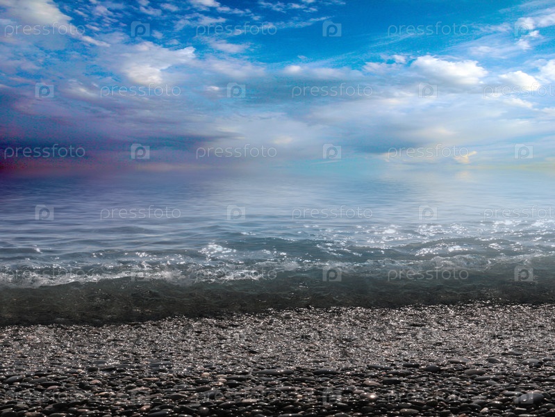 Красивый морской галечный пляж и облачное солнечное небо
