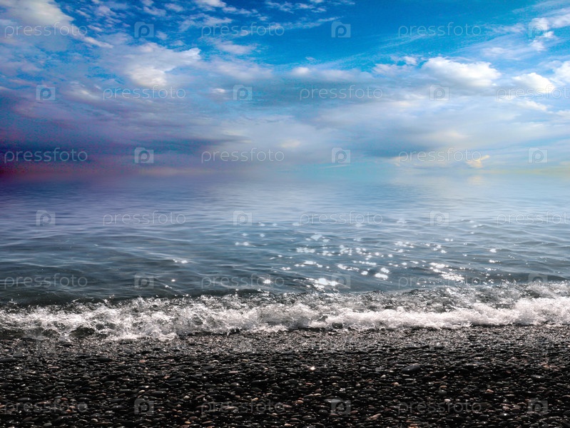 Красивый морской галечный пляж и облачное солнечное небо