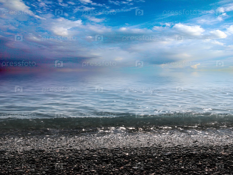 Красивый морской галечный пляж и облачное солнечное небо