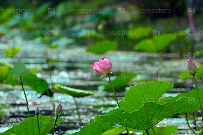 Красивый цветок лотоса на поверхности воды озера