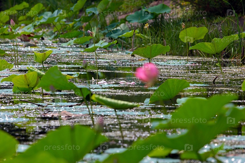 Красивый цветок лотоса на поверхности воды озера