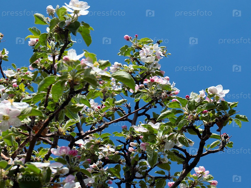 Красивые свежие бело-розовые цветки на ветвях весенней яблони