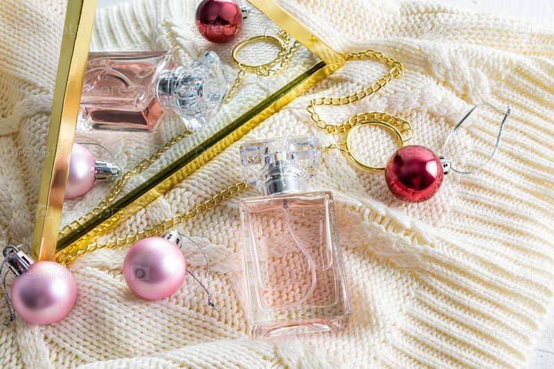 Флакон женских духов отражается в зеркале с елочными шарами. вязаный бежевый фон. Концепция подарка, презентация аромата