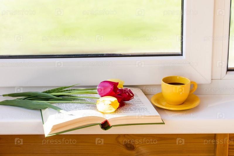 Срезанные тюльпаны лежат на открытой книге. рядом на подоконнике чашка пробуждающего кофе