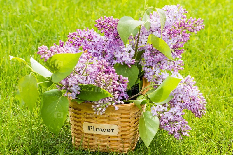 Плетеная цветочная корзина с букетом садовой сирени на зеленой весенней траве. коттеджная композиция