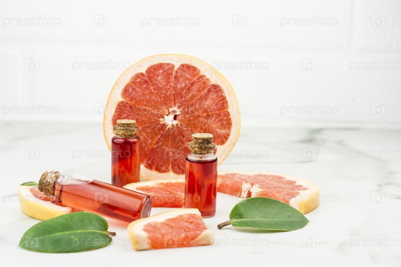 Три стеклянные бутылки с пробкой с маслом или эссенцией грейпфрута на мраморном фоне с фруктовыми лизунами. конец естественной заботе о себе