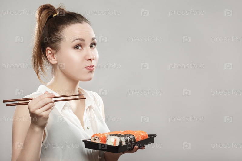 Женщина ест суши