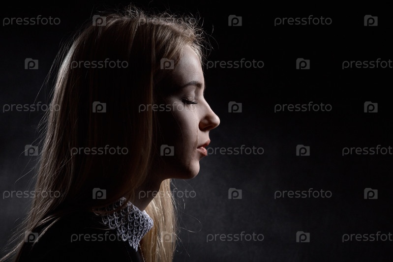 Грустная девушка плачет на черном фоне