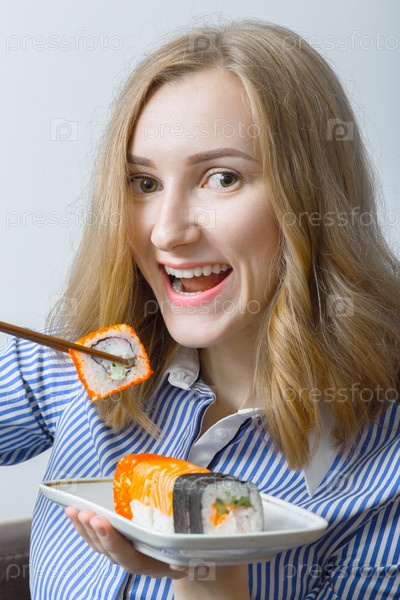 Девушка ест суши