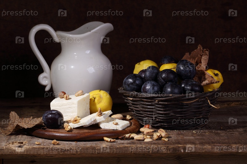 Натюрморт с медом,брынзой и яблоками