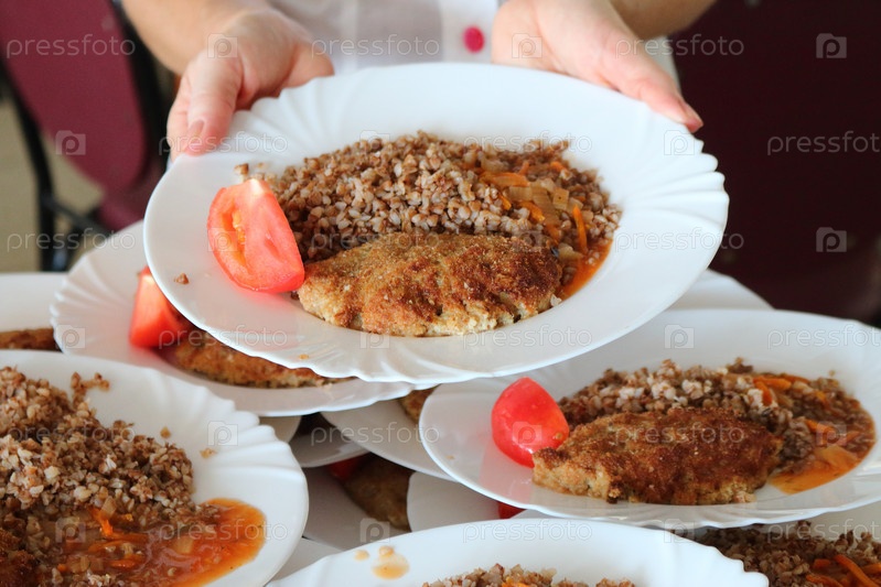 Гречневая каша с котлетой и помидором