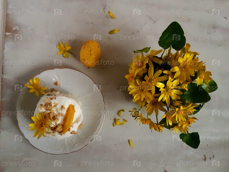 Пасхальный творог с изюмом с лимоном и букетом цветов на сером фоне