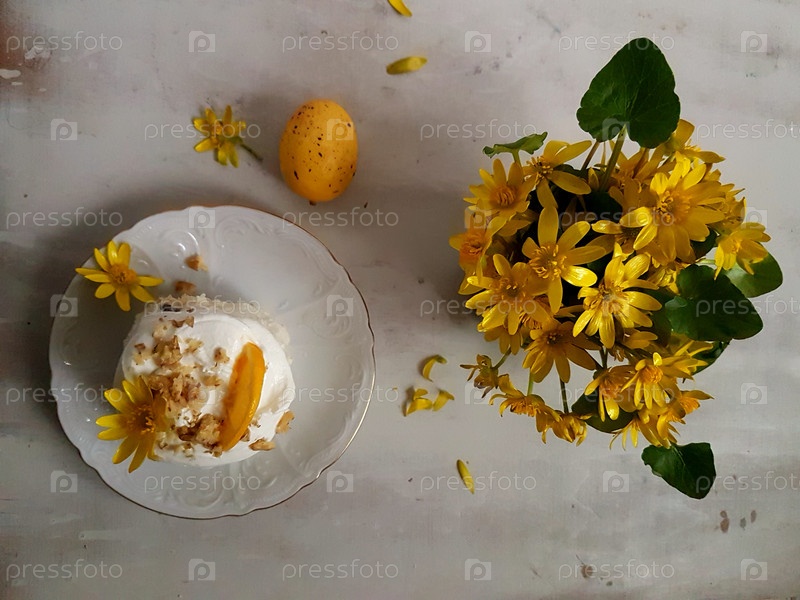 Пасхальный творог с изюмом с лимоном и букетом цветов на сером фоне