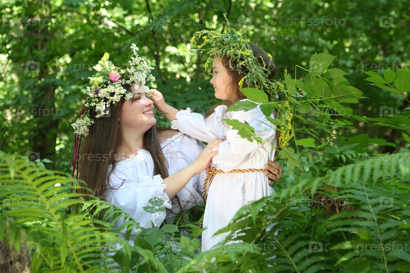 Женщина с девочкой в венках в зарослях папоротника в славянской одежде