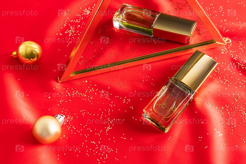 Прозрачный флакон духов лежит на красной атласной ткани и отражается в зеркале с елочными шарами. концепция подарка к празднику