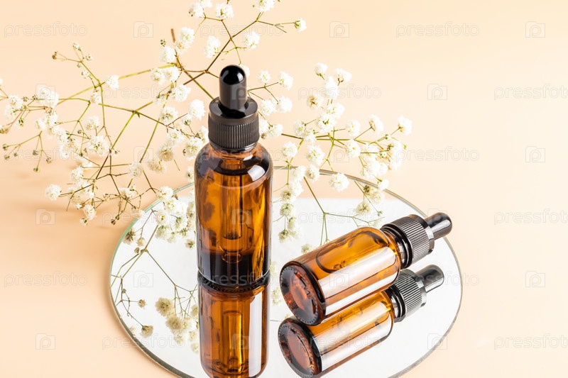 Две стеклянные бутылки с капельницей для ухода за кожей лица на круглом зеркале с белой гипсофилой. натуральная косметика. увлажняющий. бежевый фон