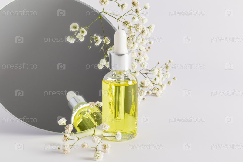 Стеклянная бутылка с пипеткой отражается в круглом зеркале с гипсофилой. передний план. пастельный фон. презентация косметического продукта