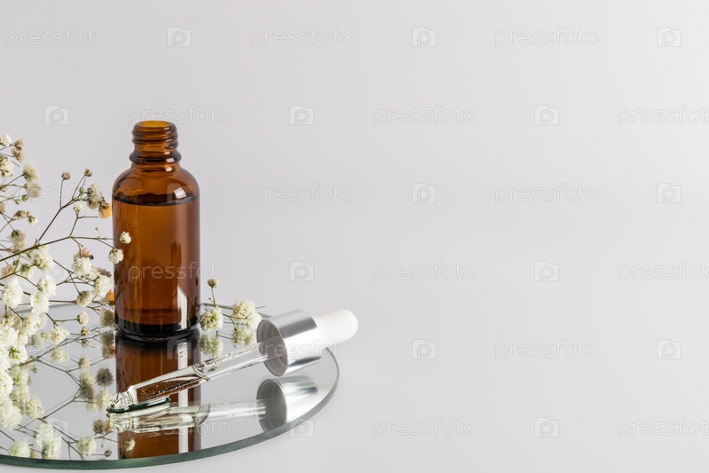 Открытая бутылка с увлажняющим кремом и средством для питания кожи стоит на круглом зеркале с наполненной пипеткой. копия пространства. избирательный фокус