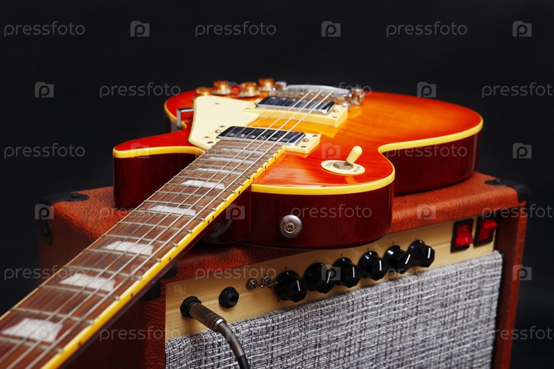 Коричневый гитарный комбо с медовой гитарой солнечных лучей на черном фоне