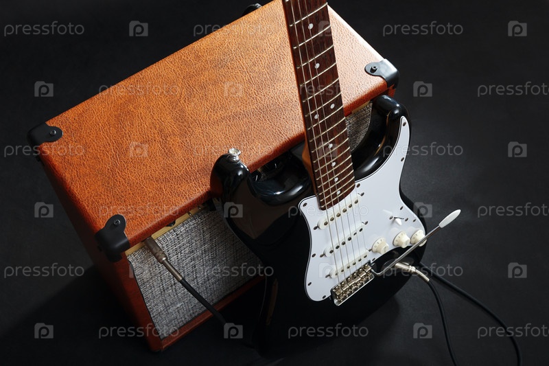 Гитарный комбо с черной гитарой на черном фоне
