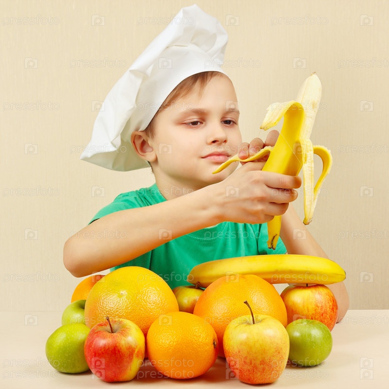Маленький смешной шеф-повар чистит свежий банан за столом с фруктами
