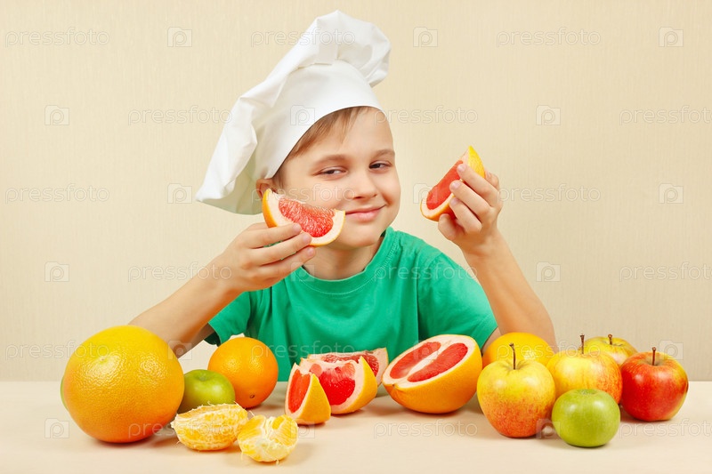 Молодой улыбающийся мальчик в шляпе шеф-повара с двумя ломтиками грейпфрута за столом с фруктами