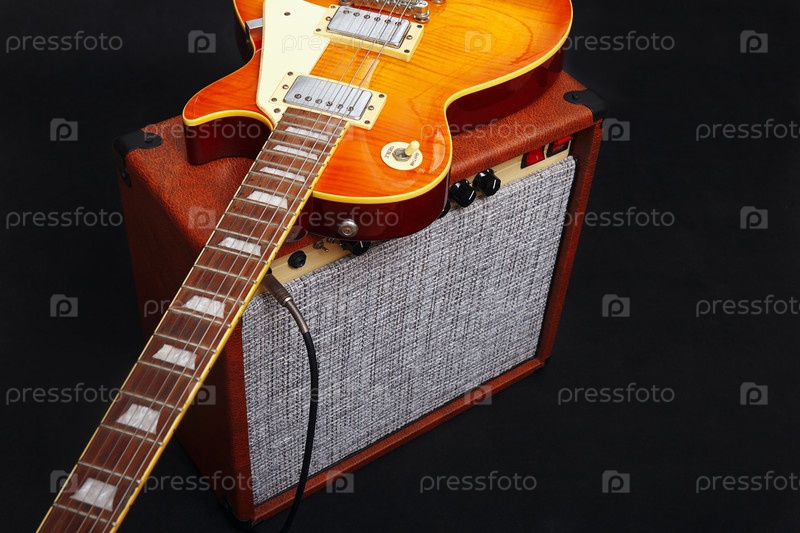 Коричневый ламповой комбо-усилитель для гитары с медовой гитарой Sunburst на черном фоне