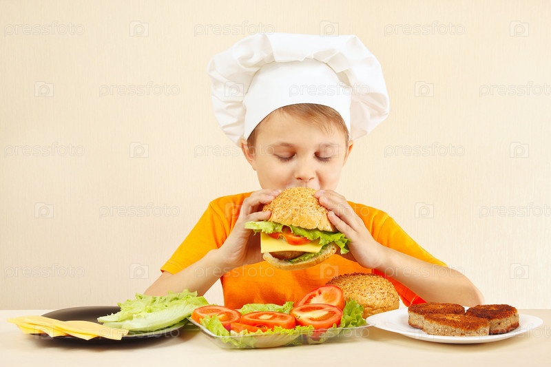 Маленький мальчик в шляпе шеф-повара пробует приготовленный гамбургер
