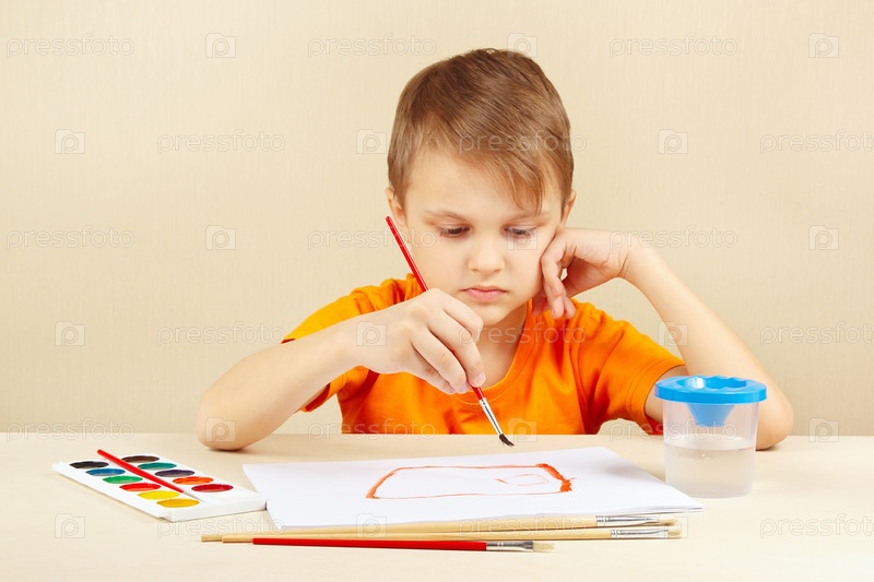 Маленький мальчик в оранжевой рубашке рисует цвета