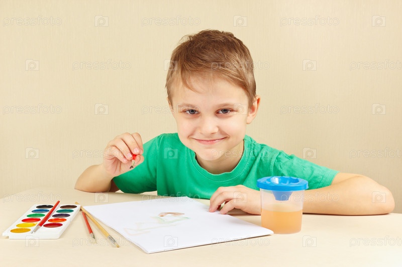 Молодой художник в зеленой рубашке рисует акварелью