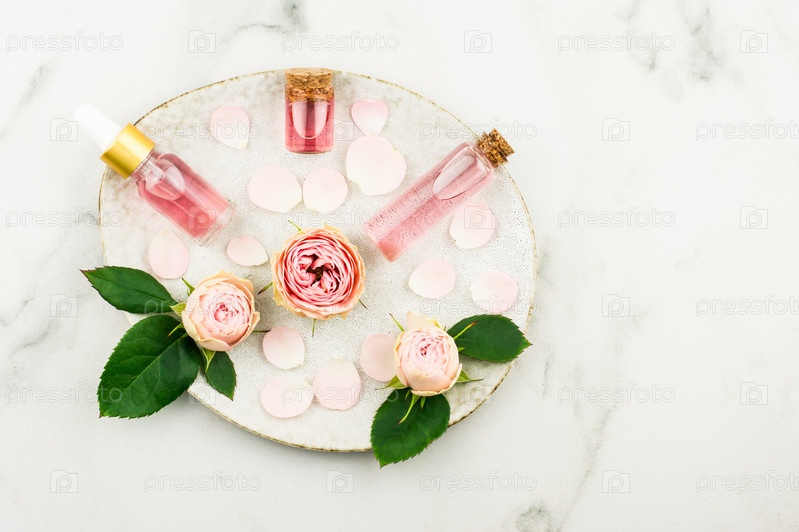 Вид сверху на оригинальную керамическую тарелку с бутылками косметического розового масла, розовой воды, бутонами и лепестками роз