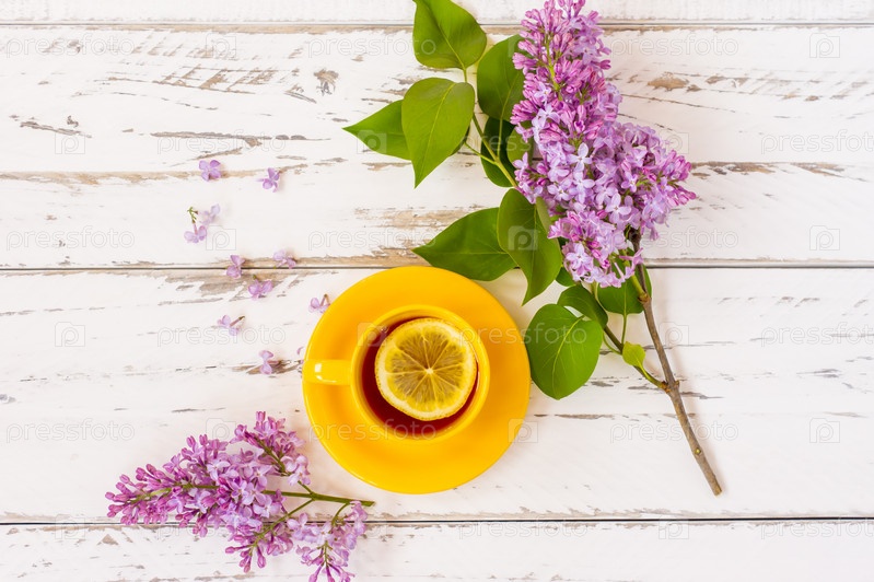 Желтая керамическая чашка с чаем и ломтиком лимона на белом деревянном столе с ветвями красивой сирени. концепция загородного отдыха