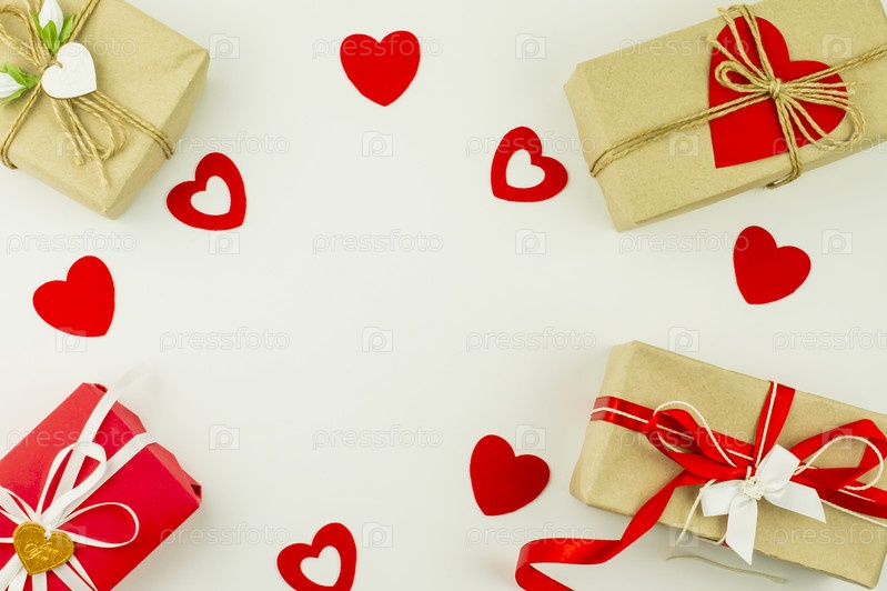День святого Валентина праздничный фон. подарочные коробки из крафтовой бумаги, украшенные цветными сердечками и красными сердечками на белом фоне. вид сверху. плоская планировка